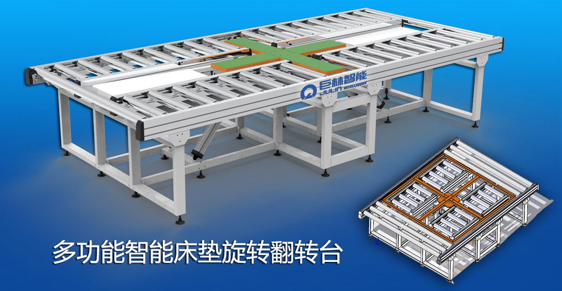 巨林智能可以定制各种床垫非标设备,床垫自动旋转翻转台和滚筒线配套使用,节省人力,智能无尘自动翻转,提高生产效率,提升产品质量。