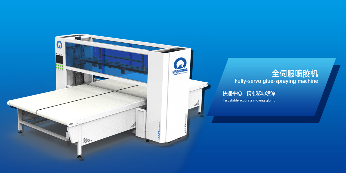 巨林智能床垫喷胶机采用全自动伺服电机,高清全彩触摸中控大屏,程序设置好之后,无需人工操作,可精准控制胶头喷嘴位置移动喷涂,快速高效,可根据需求调节速度,自动对中调位,可喷涂海绵沙发等软质床垫。