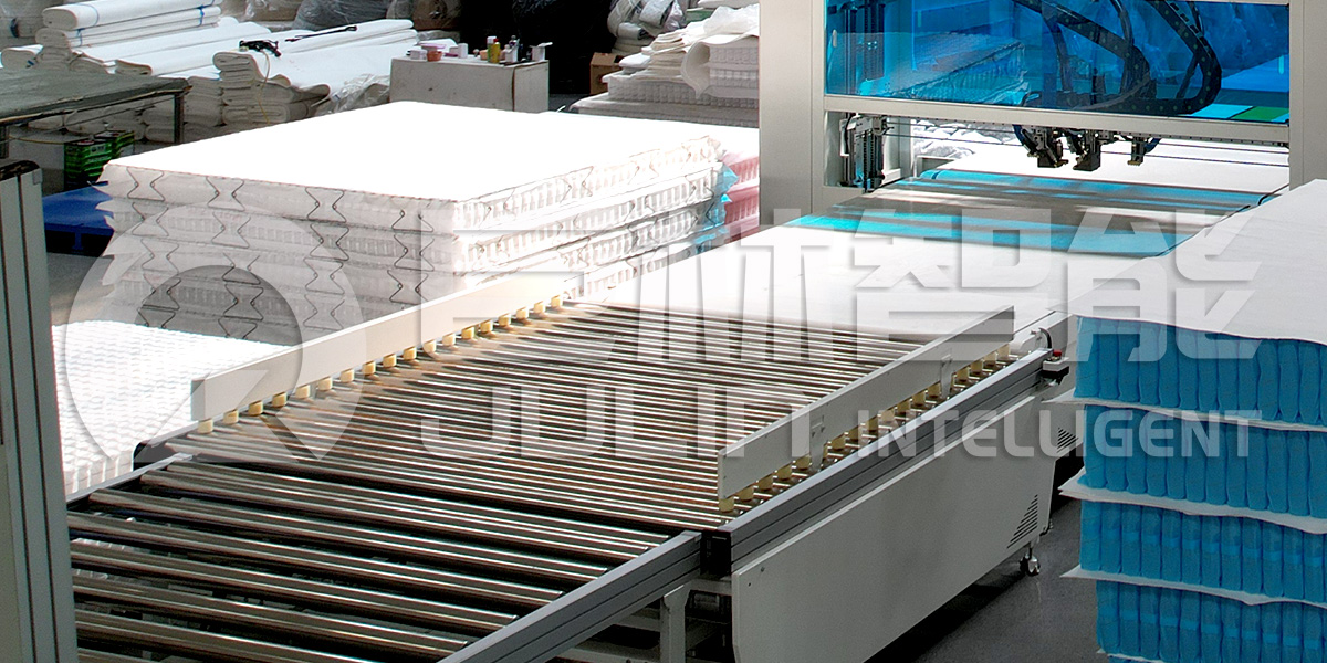 2、自动化程度高,配套自动床簧机、自动打钢边机、自动打底机、自动喷胶机、机器人床垫精准复合、自动压缩包装机、自动码垛机、半自动围边机以及AGV自动运行小车,立体运输系统,朝生产无人化发展 。
