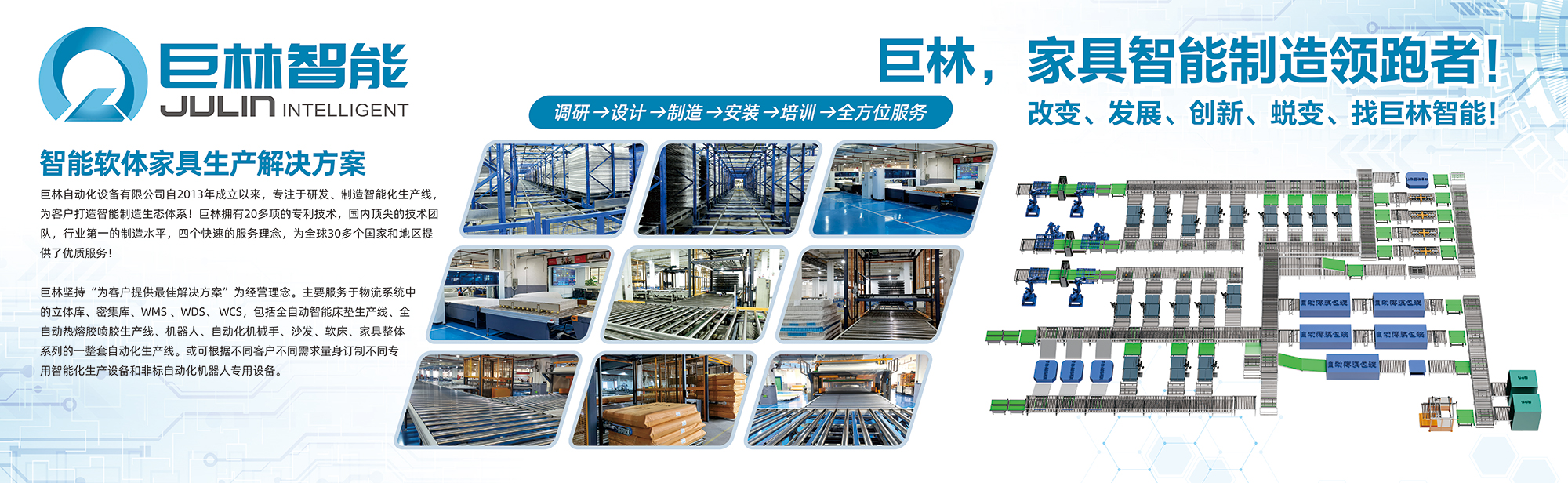![]() 当前,随着互联网、物联网、人工智能、5G、大数据等新一代电子信息技术与制造业的深度融合,工业4.0智能化已在全球广泛应用,智能制造工业5.0的时代即将来临。 ![]() 家具设备的发展引领着家具产业的变革,为行业的发展提供着源源不断的动力,巨林智能十多年专注于全自动智能床垫、热熔胶喷胶生产线的打造,搭载大数据采集系统,无缝对接ERP、MES、立体库、密集库、WMS、WDS、WCS,可根据客户的不同需求,量身订制床垫专用输送机、框边机、弹簧机、围边机、提升机、堆垛机、翻转机、叠层机、喷胶机、包装机等智能化床垫生产设备和非标自动化机器人专用设备。 ![]() 改革和创新是企业发展的必经之路,每次变革都是一次行业的重新洗牌,巨林自动化以专业的技术和优质的服务,助力各大床垫家具品牌搭载智造时代的高速快车,助您实现床垫生产、仓储、运输等全生命周期的监控和追溯,数字化智能工厂的改造可有效降低能源消耗、提高企业生产效率、提升产品的质量、塑造品牌实力、创造更大的商业价值。 不负遇见,不负期望,巨林智能致力为床垫行业提供更具竞争力的全自动智能制造一体化解决方案。 |